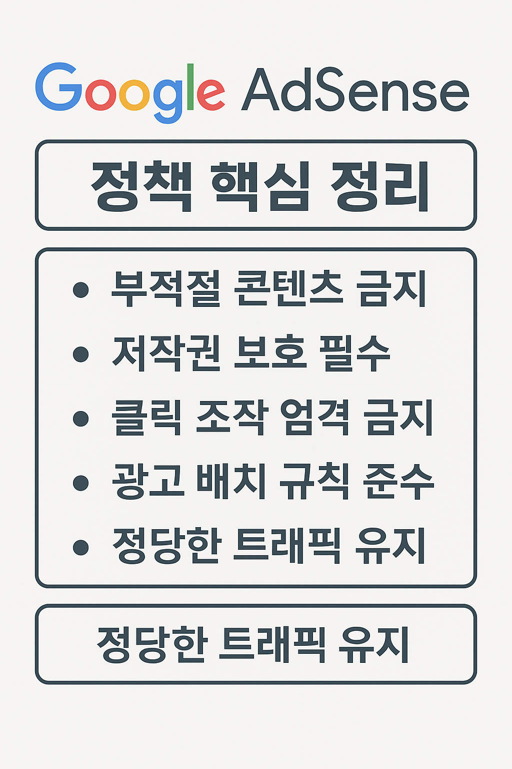 - 클릭 조작 엄격 금지: 스스로 광고 클릭하거나 클릭 유도 문구 사용 불가.